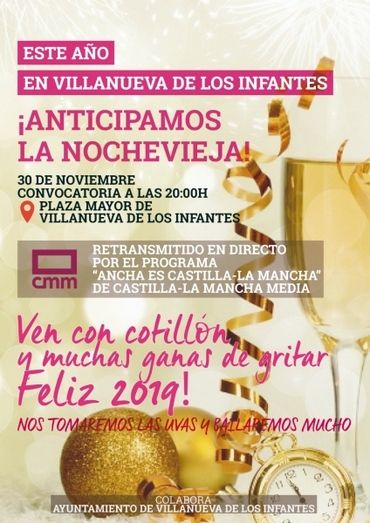 Este viernes día 30 de noviembre Villanueva de los Infantes se adelanta a la Noche Vieja manchega celebrando las campanas desde la balconada del ayuntamiento. Quiere celebrarlo junto con todos los infanteños y todos los castellanos manchegos. Sera retrasmitido en directo por el programa de televisión Ancha es Castilla La Mancha.