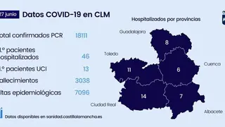 El número de altas epidemiológicas desde el inicio de la pandemia es 7.096. Por provincias, Ciudad Real acumula 2.212 altas epidemiológicas, Toledo 2.134, Albacete 1.476, Cuenca 646 y Guadalajara 628.