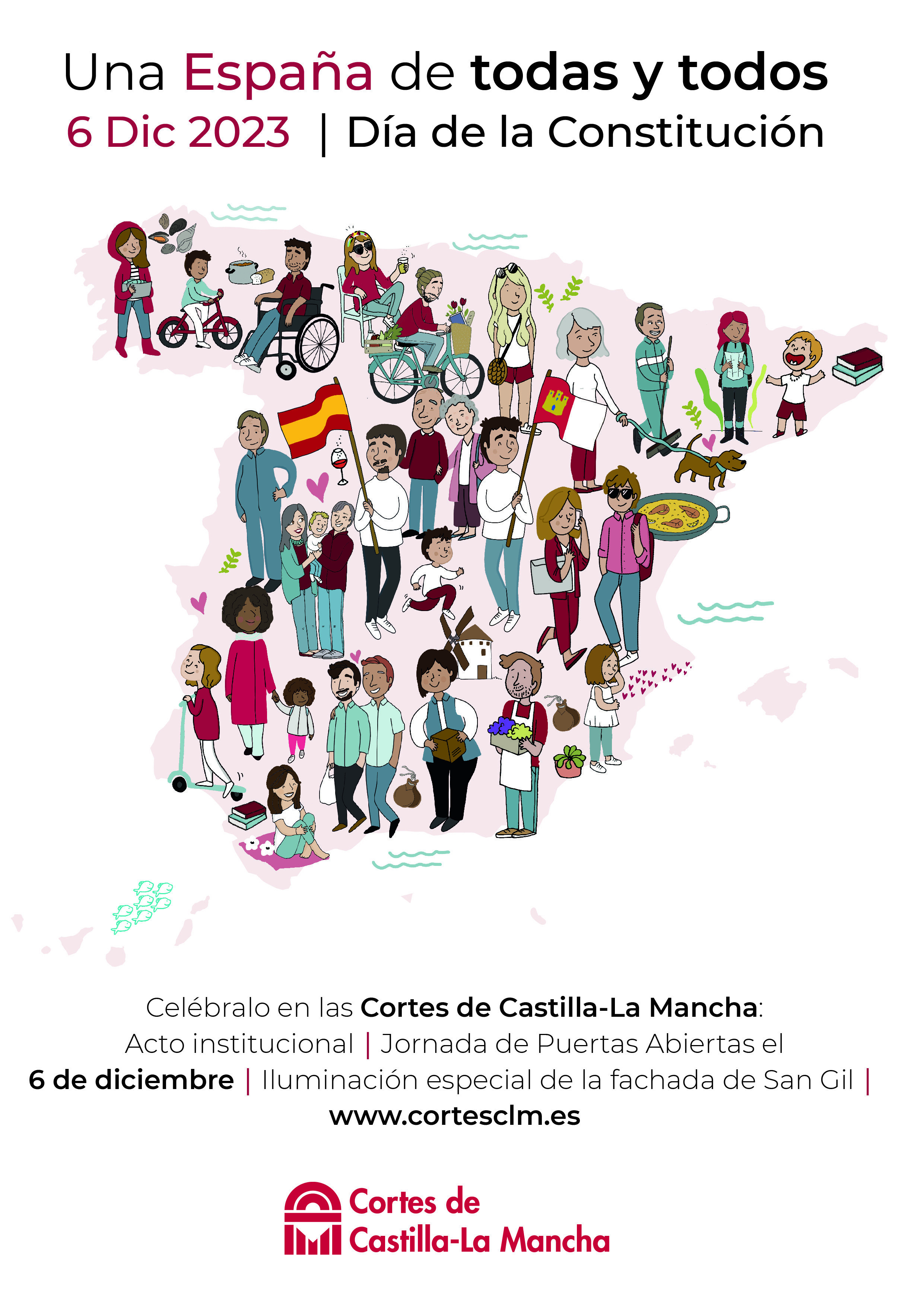 Este aniversario coincide con los 40 años de creación de las Cortes de Castilla-La Mancha, tras su constitución por vez primera tras unas elecciones en 1983. El Parlamento Autonómico completa la celebración del Día de la Constitución con una campaña que tiene como lema ‘Una España de todas y todos’ y que ha contado con unas creatividades de la ilustradora guadalajareña Patri Dubre en la que, en el marco de una única España, tienen cabida personas de muy diversa procedencia e identidad.
