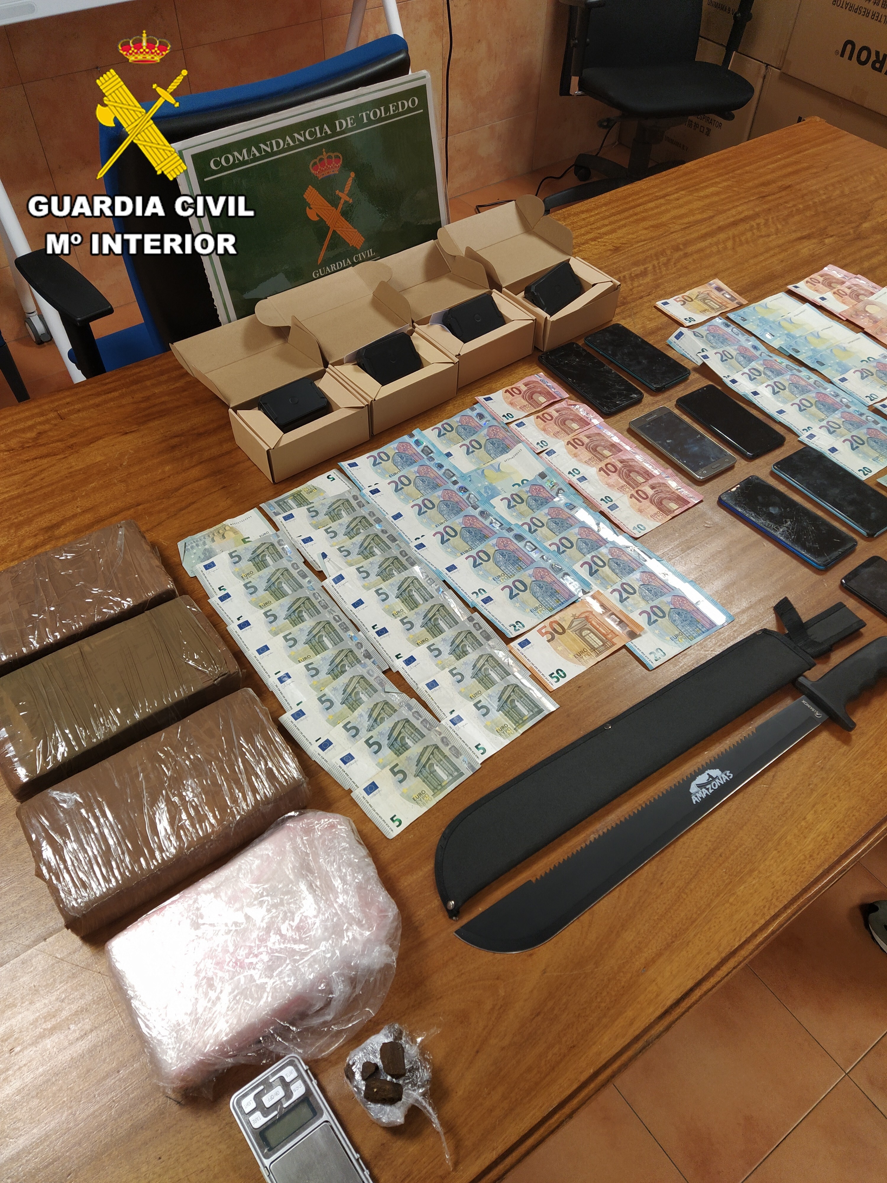 En la primera fase de la operación, la Guardia Civil detiene a un hombre en Carranque (Toledo), y halla en su domicilio casi cuatro kilos de cocaína, una plantación indoor con 1.200 plantas, cinco dispositivos GPS idénticos al que las denunciantes tenían instalado en su vehículo y hachís. Un día después, otras dos personas fueron detenidas en Ocaña (Toledo).