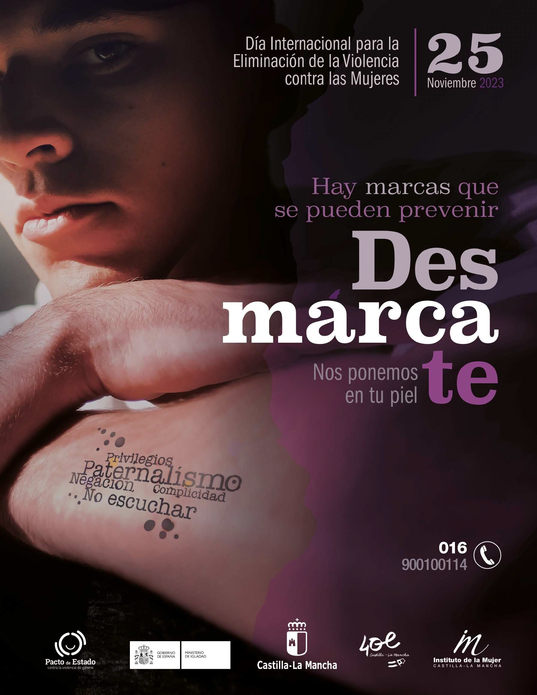Bajo el lema ‘Desmárcate’, la campaña muestra a un perfil femenino y a otro masculino con marcas de la violencia de género tatuadas en su piel. Marcas en la mujer, con palabras como ‘violencia’, ‘acoso’, ‘desigualdad salarial’ o ‘ninguneo’, y marcas en el hombre con los términos ‘negación’, ‘privilegios’, ‘no escuchar’ o ‘paternalismo’.