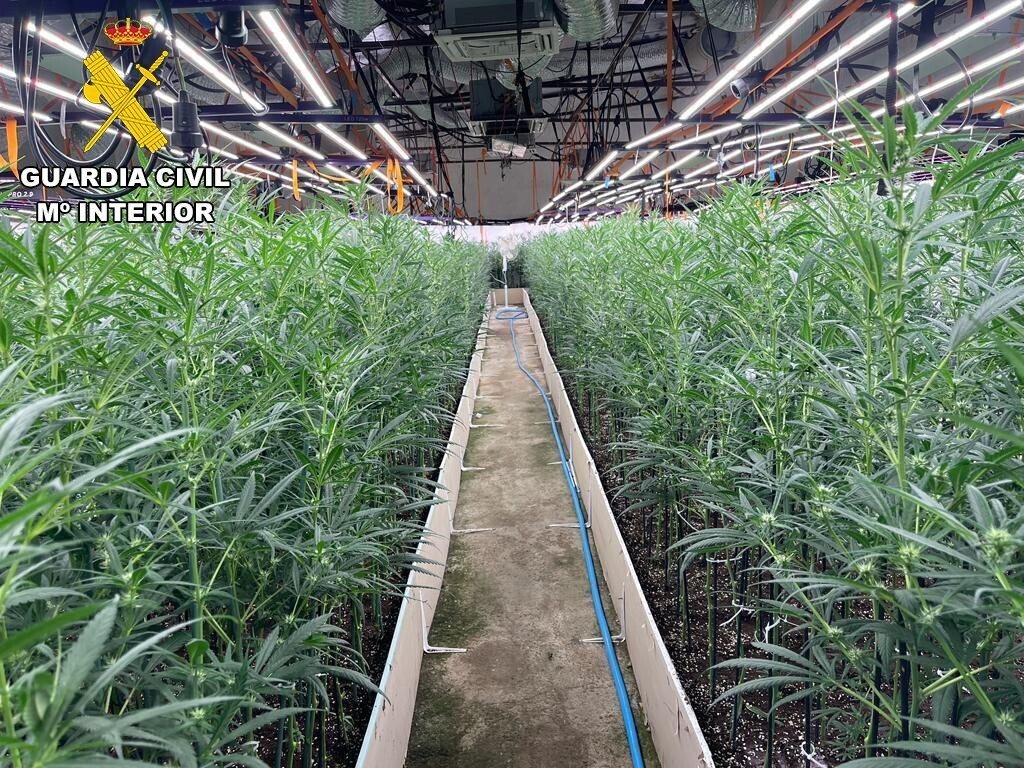 En el interior del recinto se localizaron dos plantaciones de marihuana tipo “indoor”, una de 2962 que se encontró en la vivienda y otra en la nave agrícola con 3242, todas ellas en avanzado estado de desarrollo.