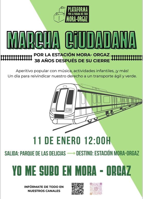 La marcha partirá del Parque de las Delicias y culminará en el entorno de la estación Mora-Orgaz. La jornada, de carácter reivindicativo y festivo, incluirá música, actividades infantiles y un aperitivo popular, en una convocatoria que lleva por lema “Yo me subo en Mora-Orgaz”.