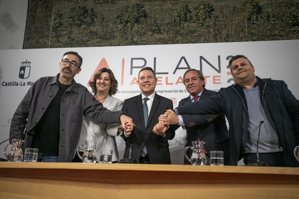 En la firma del Plan Adelante, además del presidente regional, Emiliano García-Page, y de la consejera de Economía, Empresas y Empleo, Patricia Franco; han participado el presidente de CECAM, Ángel Nicolás; el secretario regional de CCOO, Paco de la Rosa; y el secretario regional de UGT, Luis Manuel Monforte.
