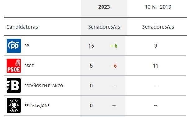 Estos datos electorales reflejan que el Partido Popular ha sacado tres senadores en cada una de las cinco provincias, mientras que el PSOE se queda con un único representante por provincia.