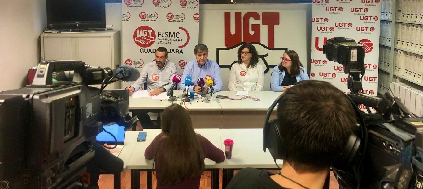 La secretaria general de UGT CLM, Lola Alcónez, acompañada de la secretaria general de FeSMC UGT CLM, Ana González; Alfredo Ávila, secretario general de la Federación en la provincia de Guadalajara; y Félix Frutos, responsable regional del sector Limpieza; han anunciado la sentencia en una rueda de prensa en Guadalajara.