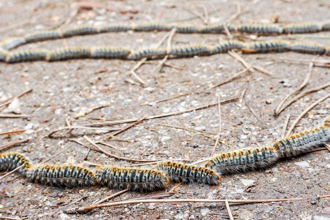 Cuando comienzan a subir las temperaturas, las orugas descienden de los árboles en fila para enterrarse bajo tierra y realizar la metamorfosis, y es precisamente en este punto donde resultan más peligrosas.