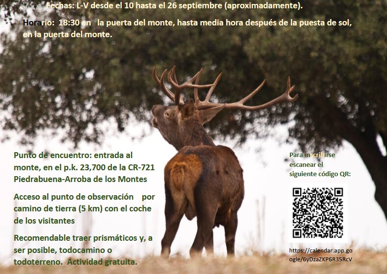 El delegado provincial de Desarrollo Sostenible en Ciudad Real, Casto Sánchez, invita a la ciudadanía a inscribirse cuanto antes para poder participar en esta actividad gratuita en el siguiente enlace: https://calendar.app.google/6yDzaZKP6R35RcVCA, explicando que el acceso al punto de observación transcurre por un camino de tierra, accesible con el coche de los visitantes, siendo recomendable ir provistos de prismáticos y, a ser posible, todocamino o todoterreno. El monte de Utilidad Pública nº 49 ‘Nuestra Señora del Rosario’ es propiedad de la Junta de Comunidades de Castilla-La Mancha.