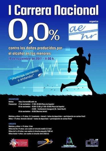 La Asociación Española de Hígado y Riñón (AEHR) organizará el 19 de noviembre de 2017, a las 11:00 horas, en el Recinto Ferial de Alcázar de San Juan, la I Carrera Nacional 0,0% contra los daños producidos por el alcohol en los menores de edad. Esta carrera tiene como fin concienciar a la sociedad sobre la importancia de la prevención de las enfermedades relacionadas con el alcohol, que en la última década han aumentado de manera espectacular. Según el presidente de la AEHR y médico especialista en Aparato Digestivo, el Dr. Sami Aoufi Rabih, es cada vez mayor el número de pacientes de entre 20 y 30 años con cirrosis por el fenómeno del botellón.