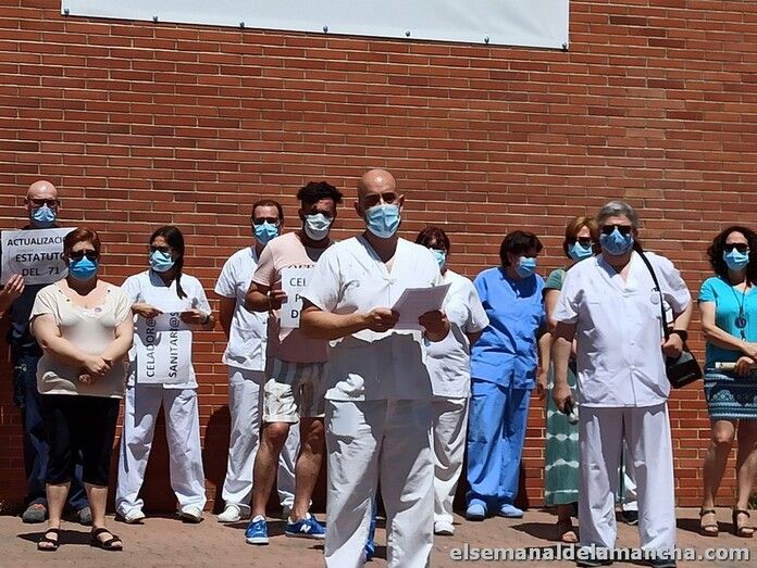 La “Plataforma Reconocimiento para el Celador Ya!” se ha concentrado este jueves a las puertas del Hospital General La Mancha Centro de Alcázar para leer un manifiesto y reivindicar, entre otras cosas, que no se les catalogue como personal de bajo riesgo, mostrando así su disconformidad “con el trato que hemos recibido los del Sistema Nacional de Salud por parte de las administraciones desde que se proclamó el Estado de Alarma por la pandemia”.