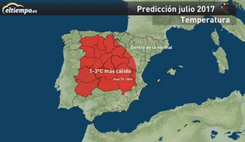 Este mes de julio se espera más cálido de lo normal en zonas del interior peninsular y dentro de la media en el resto del país, según previsiones de Eltiempo.es.