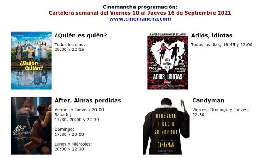 CARTELERA CINEMANCHA El Semanal 10 de septiembre de 2021 (14:41 h.) Del viernes 10 al jueves 16 de septiembre La película DARTACÁN Y LOS TRES MOSQUEPERROS se proyecta sábado y domingo a las 17.30 horas. Leer más