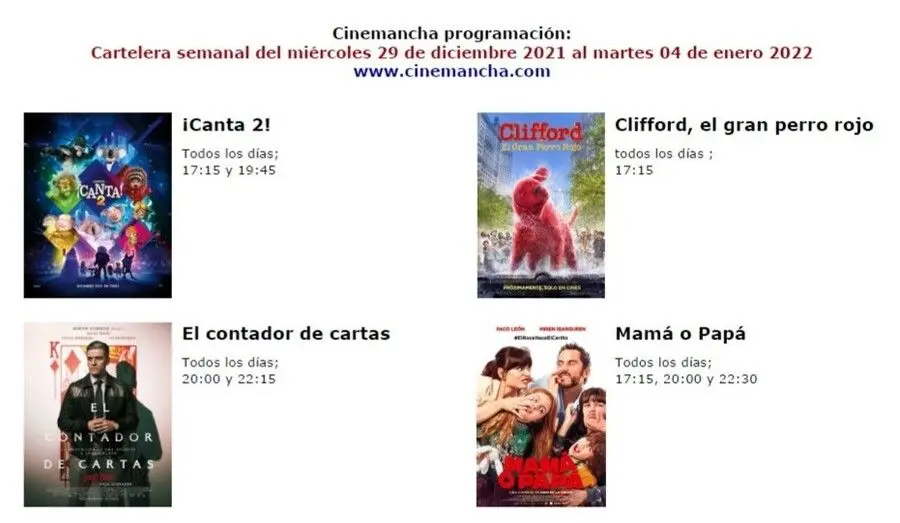 El Semanal 28/dic/21 - 18:23 Siguiente chevron_right Multicines Cinemancha cerrará el viernes día 31, y abrirá el martes día 4. Todos los días abre a las 16:15 horas. Siguiente chevron_right