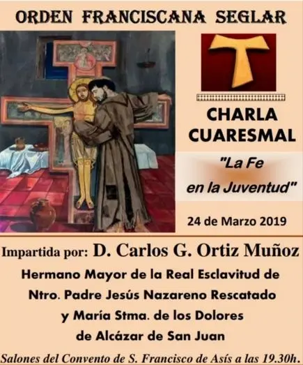 Con motivo del Tiempo Litúrgico de Cuaresma, la Orden Franciscana Seglar (OFS) de Alcázar de San Juan ha organizado una Charla Cuaresmal que se llevará a cabo en los salones del Convento de San Francisco de Asís de Alcázar de San Juan (Altozano de la Inmaculada, 17) el domingo 24 de marzo a las 19:30h.