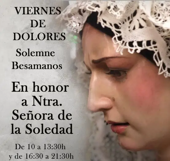 La Cofradía del Santo Entierro, como viene siendo costumbre y tradición, celebrará Besamanos en honor a su sagrada Titular desde las 10:00 h., interrumpiéndose a las 13:30h., para continuar desde las 16:30h., ya sin interrupción, hasta las 21:30 h. En todo momento, la Imagen Titular del Santo Entierro estará acompañada por las mujeres de la Cofradía, Damas de Nuestra Señora de la Soledad, que por turnos de 30 minutos harán guardia ante Ella todo el tiempo. A las 20:30 h. se celebrará la Función Solemne en su Honor.