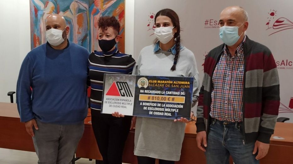 Miembros del Club deportivo Altomira de Alcázar de San Juan han hecho hoy entrega a la Asociación de Esclerosis Múltiple de Ciudad Real de la recaudación obtenida en la carrera virtual organizada este año por el Club, y que ha suplido a la Media Maratón “Memorial Mariano Rivas Rojano”, ante la imposibilidad de poder celebrarla este año de forma presencial por la crisis sanitaria.