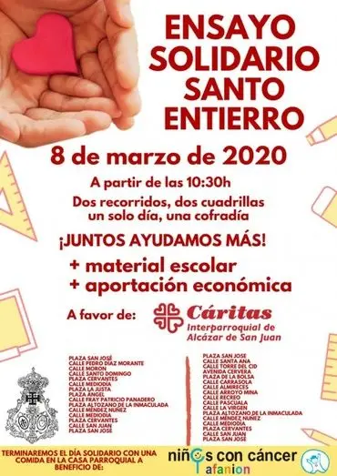 El ensayo tendrá lugar a partir de las 10:30 horas hasta las 14:00 horas, con un nuevo recorrido y un nuevo formato, recogiendo durante el ensayo aportaciones económicas y material escolar, a favor de Cáritas Interparroquial de Alcázar de San Juan. Cada una de las Cofradías participantes, llevarán a cabo distintos recorridos a lo largo de la ciudad uniendo sus itinerarios en la Plaza del Altozano.