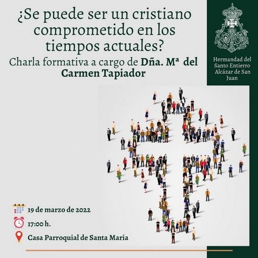 La Cofradía del Santo Entierro ha programado una importante charla formativa para el sábado 19 de marzo. Se titula “¿se puede ser un cristiano comprometido en los tiempos actuales?” y su ponente será Dña. Mª del Carmen Tapiador.