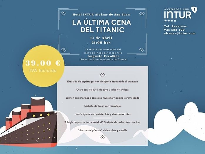 El Hotel Intur de la localidad ya tiene todo listo para celebrar una novedosa y sugerente cita: «La Última Cena del Titanic». Un evento en el que se recreará el menú original que se sirvió en el conocido transatlántico por el cocinero Auguste Escoffier.