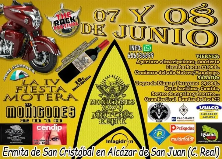 La Asociación motera alcazareña Moñigones Motors Élite ha organizado, con la colaboración del Ayuntamiento y la Hermandad de San Cristóbal, actividades para todo el fin de semana del 7 y 8 de Junio para su IV Fiesta motera que se va a celebrar con base en la Ermita de San Cristóbal. El precio de inscripciones es de 10 Euros. Habrá rutas moteras, conciertos y comidas de convivencia. Zona de acampada y desayuno, sorteo exhibiciones, etc.