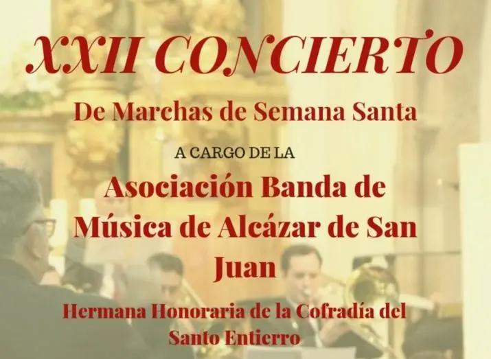 La cita será a las 20:30 horas en la Parroquia de Santa María La Mayor a cargo de la Asociación Banda de Música de Alcázar de San Juan (Hermana Honoraria de la Cofradía), dirigida por Luis Sánchez Romanos, con presentación de Luis Ramón Moreno González, poeta y escritor, miembro de la Cofradía del Santo Entierro.