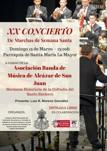 La cita será a las 13:00 horas en la Parroquia de Santa María La Mayor a cargo de la Asociación Banda de Música de Alcázar de San Juan (Hermana Honoraria de la Cofradía), dirigida por Luis Sánchez Romanos, con presentación de Luis Ramón Moreno González, poeta y escritor, miembro de la Cofradía del Santo Entierro.
