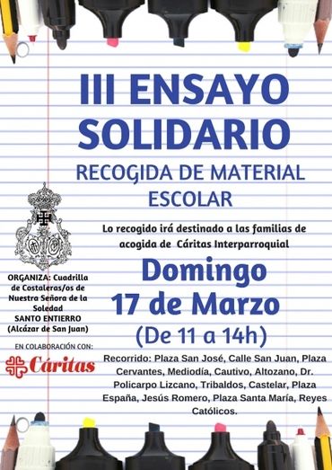 La cuadrilla de costaleras/os de Nuestra Señora de la Soledad, junto con la colaboración de la comisión de Cultos y Caridad de la Cofradía, llevarán a cabo el domingo 17 de marzo su “III Ensayo solidario”, por lo que piden colaboración en forma de recogida de material escolar para las familias de acogida que Cáritas tiene en Alcázar.