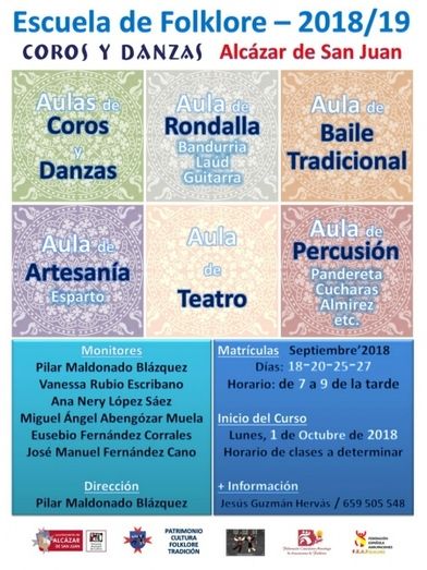 La Escuela de Folklore de la Asociación de Coros y Danzas de San Juan ha presentado la oferta educativa para este nuevo curso que se iniciará el día 1 de octubre. A las aulas de cursos anteriores, Coros y Danzas, Rondalla y Baile Tradicional, hay que sumar este próximo curso tres nuevas aulas, Artesanía, Teatro y Percusión, así pues, son seis aulas las que se ofertan desde la Asociación Cultural de Coros y Danzas de Alcázar de San Juan, adaptadas a los distintos niveles de aprendizaje.