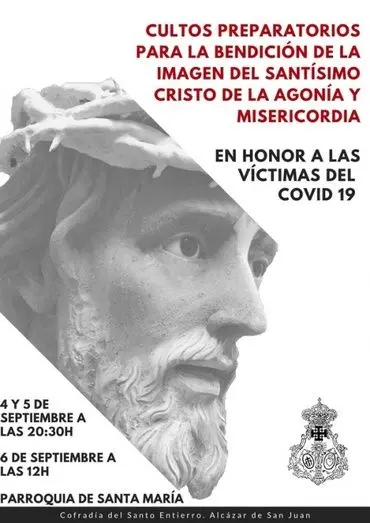 La Hermandad del Santo Entierro de Alcázar de San Juan contará el próximo fin de semana con la nueva imagen del Santísimo Cristo de la Agonía y Misericordia. Para ello, la Hermandad ha preparado una serie de actos que comenzarán el viernes día 4 a las 20:30 h. donde se celebrará una Eucaristía en Honor a las víctimas del COVID-19 de su Parroquia.
