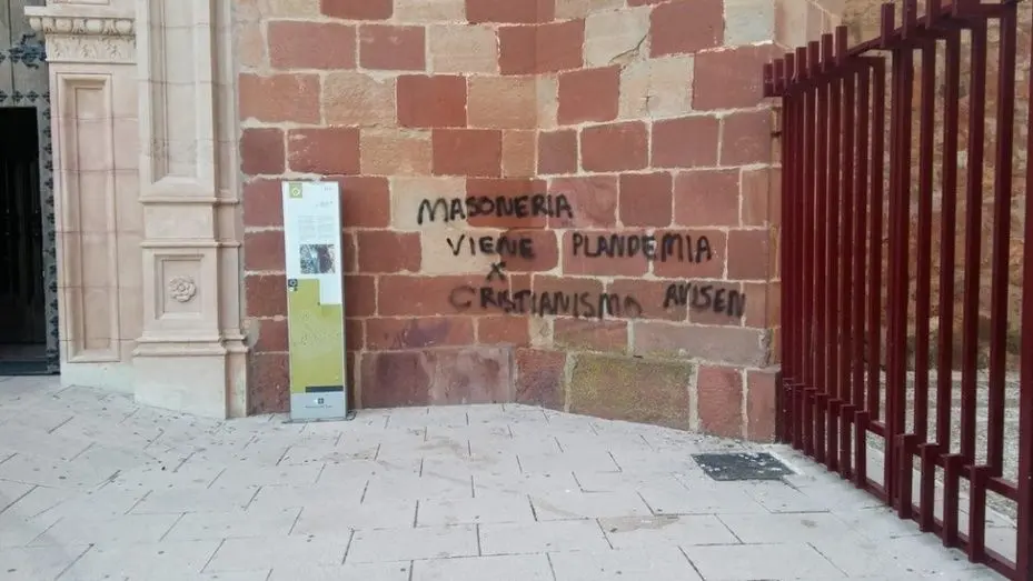 La fachada de la Iglesia de San Francisco de Alcázar de San Juan ha amanecido este lunes con una gran pintada en el lado derecho de la misma, una pintada que hace alusión a la pandemia (escrita plandemia en la pintada), a la masonería y al cristianismo.