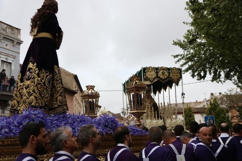 El palio que porta la imagen de la Virgen de los Dolores de terciopelo verde al igual que el manto, tuvo que verse envuelto en plástico ante las inclemencias del tiempo. La previsión de lluvia para este Viernes Santo no faltó a su cita para desgracia de todos sus penitentes, por lo que se vio obligado a modificar su recorrido.
