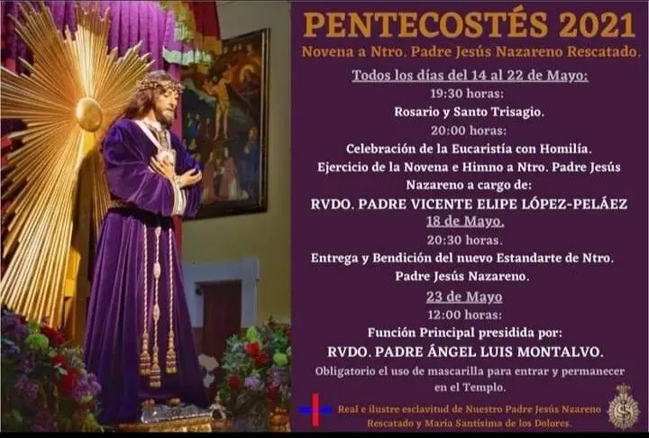 La Hermandad de Nuestro Padre Jesús Nazareno y María Santísima de los Dolores de Alcázar de San Juan ha organizado una serie de actos para conmemorar la festividad de Pentecostés, entre ellos una novena todos los días desde el 14 al 22 de mayo.