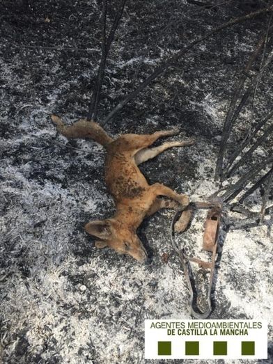 Agentes Medioambientales de Castilla-La Mancha hallan, en el transcurso de una investigación de incendios en la provincia de Toledo, el cadáver quemado de un zorro, de apenas un año de edad, atrapado en un cepo entre la vegetación que estaban analizando.