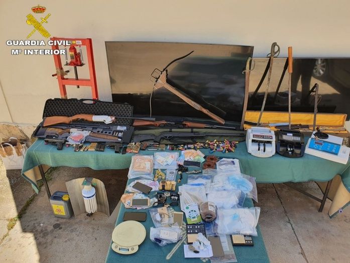 -Tres pistolas con abundante munición, además dos armas largas, un rifle y una escopeta de caza y cartuchería. Al realizar la comprobación sobre el origen de las armas, se ha verificado que las mismas proceden de sendos robos en viviendas en las localidades de Beniasan (Alicante) y Pedro Muñoz (Ciudad Real).