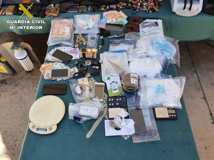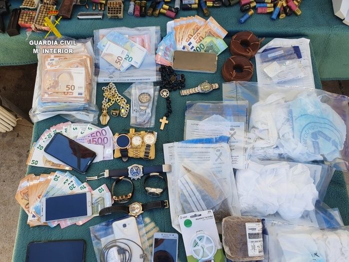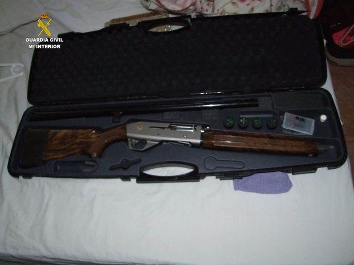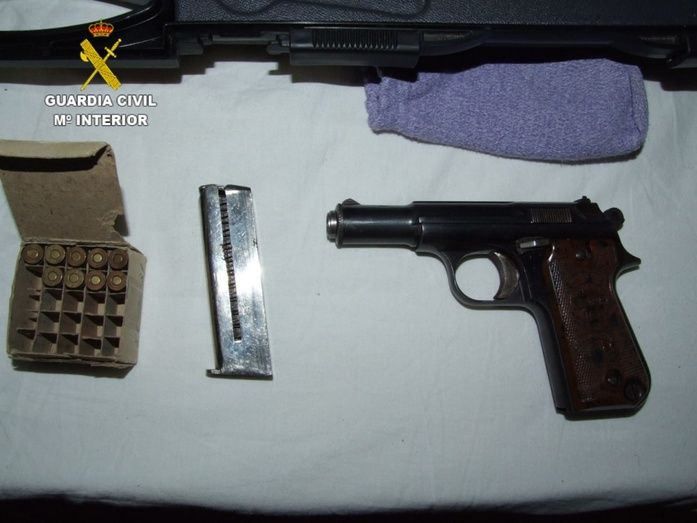 -Tres pistolas con abundante munición, además dos armas largas, un rifle y una escopeta de caza y cartuchería. Al realizar la comprobación sobre el origen de las armas, se ha verificado que las mismas proceden de sendos robos en viviendas en las localidades de Beniasan (Alicante) y Pedro Muñoz (Ciudad Real).