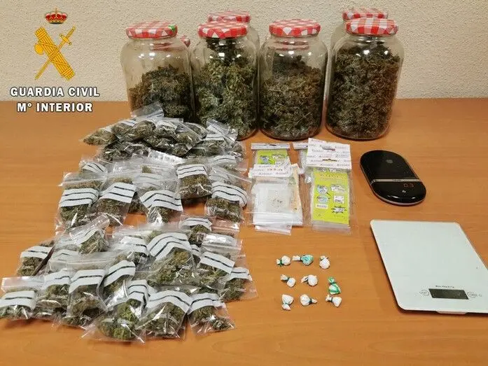 Seguidamente la Guardia Civil realizó un registro en la vivienda del responsable de ese local, donde igualmente se hallaron 37 dosis de marihuana, 960 gramos de esta sustancia en cogollos, 3 plantas de cannabis sátiva de grandes dimensiones, 7.400 € y diferentes utensilios para su pesado, envasado y distribución.