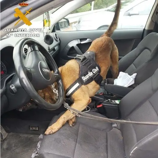 Tras la identificación del conductor y único ocupante, se llevó a cabo el registro de sus pertenencias así como del interior del turismo, siendo un can detector de estupefacientes del Servicio Cinológico del Cuerpo, de nombre ARES, quien olfateó de forma insistente la zona del cuentakilómetros del vehículo.