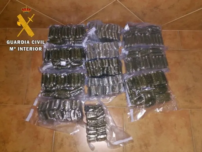 Los agentes comprobaron que estas bolsas estaban llenas de trozos de hachís, que arrojaron un peso total de 12’200 kilos, por lo que la Guardia Civil detuvo a R.B.R. por un delito de tráfico de drogas.