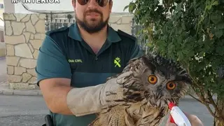 La recuperación de esta rapaz se realizó el pasado viernes en la localidad de Sacecorbo, tras el aviso de un ciudadano al teléfono de urgencias de la Guardia Civil, 062, comunicando que habían recogido el animal en la plaza del pueblo, desorientado y sin poderse mover. Personados en el lugar efectivos de la Guardia Civil de Cifuentes, se hicieron cargo del animal, tratándose de un Búho Real (Bubo bubo).