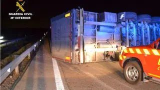 A la llegada de las patrullas de Tráfico se encuentran un aparatoso accidente entre un turismo y un camión articulado que había volcado en la calzada, quedando ésta, totalmente cortada al paso de los vehículos