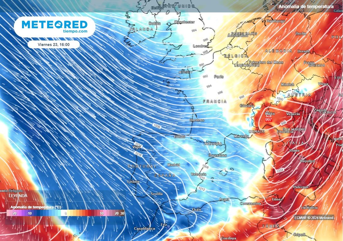 El viernes arreciará viento del noroeste y el aire polar se extenderá. Se espera que las temperaturas bajen de forma generalizada mientras que, en altura, una vaguada cruzará la Península. Esto favorecerá los desplomes de la cota de nieve y la caída de granizo o nieve granulada, así como alguna tormenta ocasional. La nieve aparecerá en los principales sistemas montañosos y también lo podría hacer en ciudades como Segovia, Burgos, Cuenca, Pamplona o Vitoria.