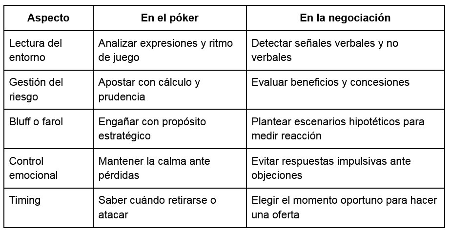 La siguiente tabla muestra cómo los principios estratégicos del póker pueden aplicarse directamente al arte de negociar:
