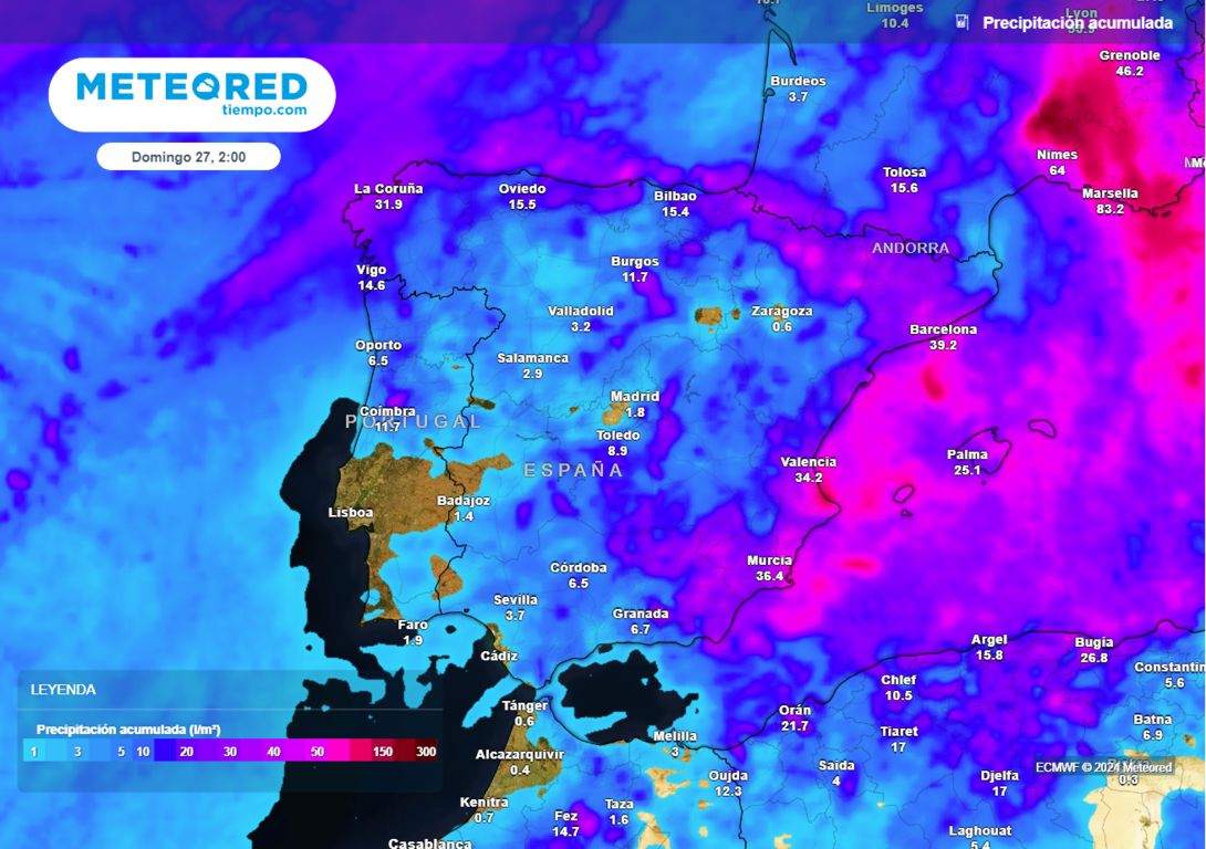 Sin embargo, las novedades llegarán por el Mediterráneo, con chubascos dispersos en Baleares debido a los efectos de la DANA que se dirige a Argelia. También podría darse alguna llovizna aislada en el este peninsular y en Canarias.