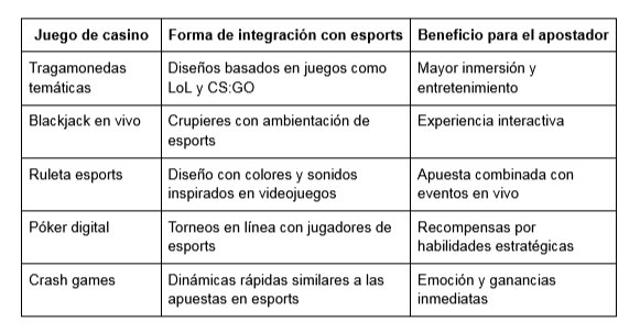 Los casinos online han evolucionado para ofrecer una experiencia más variada e inmersiva, integrando elementos de los esports en sus plataformas. Hoy en día, es común encontrar juegos de casino con temáticas inspiradas en videojuegos, dealers en vivo que presentan partidas ambientadas en esports y bonos exclusivos para los apostadores de videojuegos.