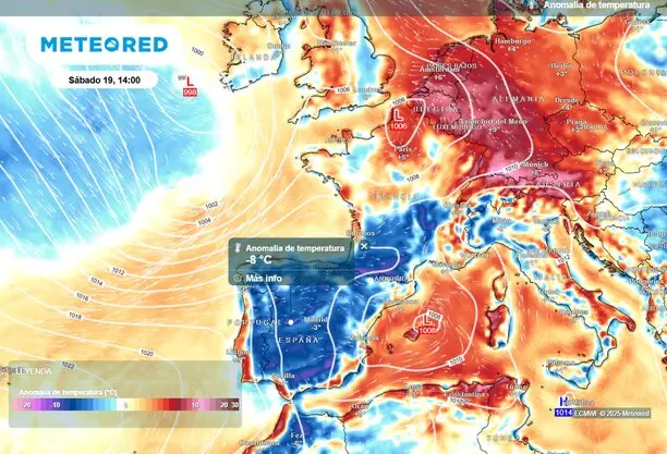 Por esta particular configuración sinóptica, en España se registrarán las anomalías térmicas "frías" o negativas más importantes en el conjunto de Europa. En concreto, tanto mañana como el domingo en diversos sectores de la vertiente atlántica, Pirineos o Cordillera Cantábrica las temperaturas pueden quedarse hasta 8 ºC por debajo del promedio de mediados de julio, según nuestros mapas.