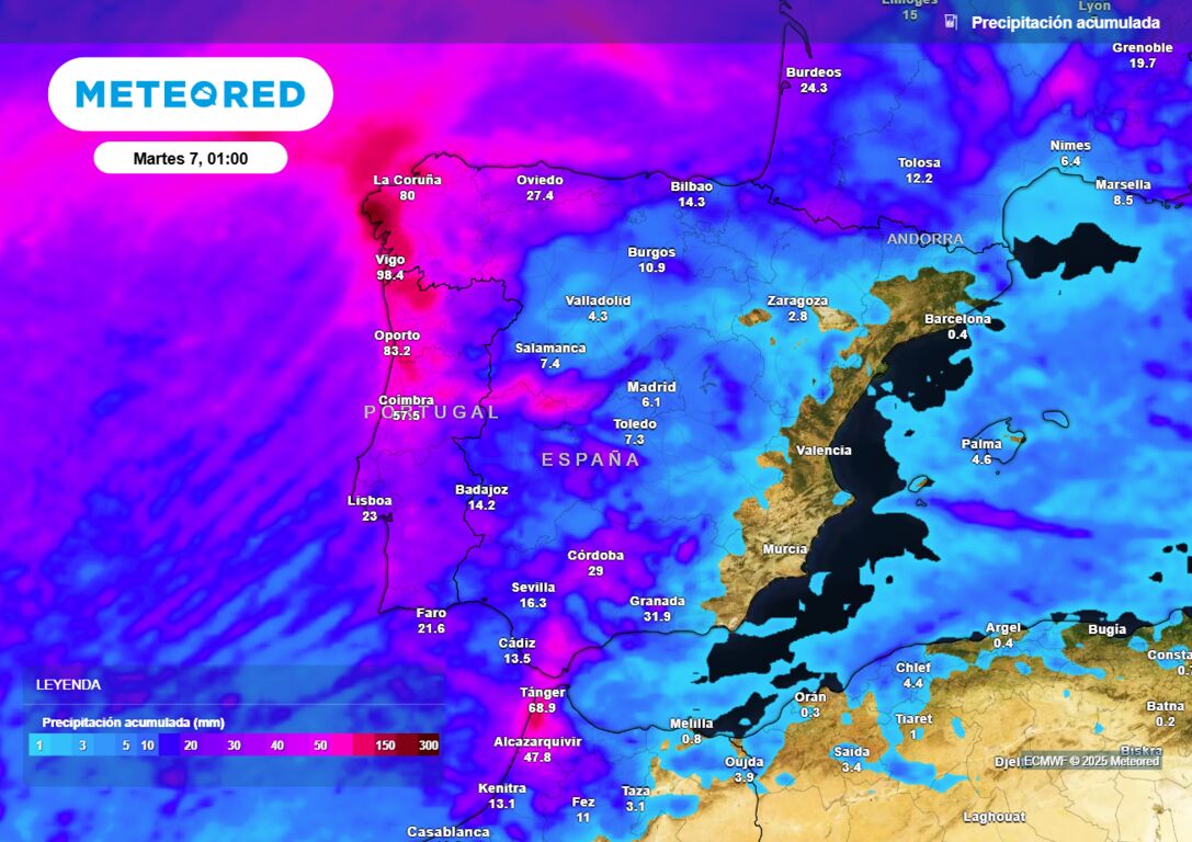 Entre el domingo y el lunes, un frente muy activo se verá reforzado por la masa de aire muy húmeda asociada al río atmosférico traerá lluvias intensas en Galicia, Sistema Central y entorno del Estrecho, y serán ocasionalmente tormentosas.