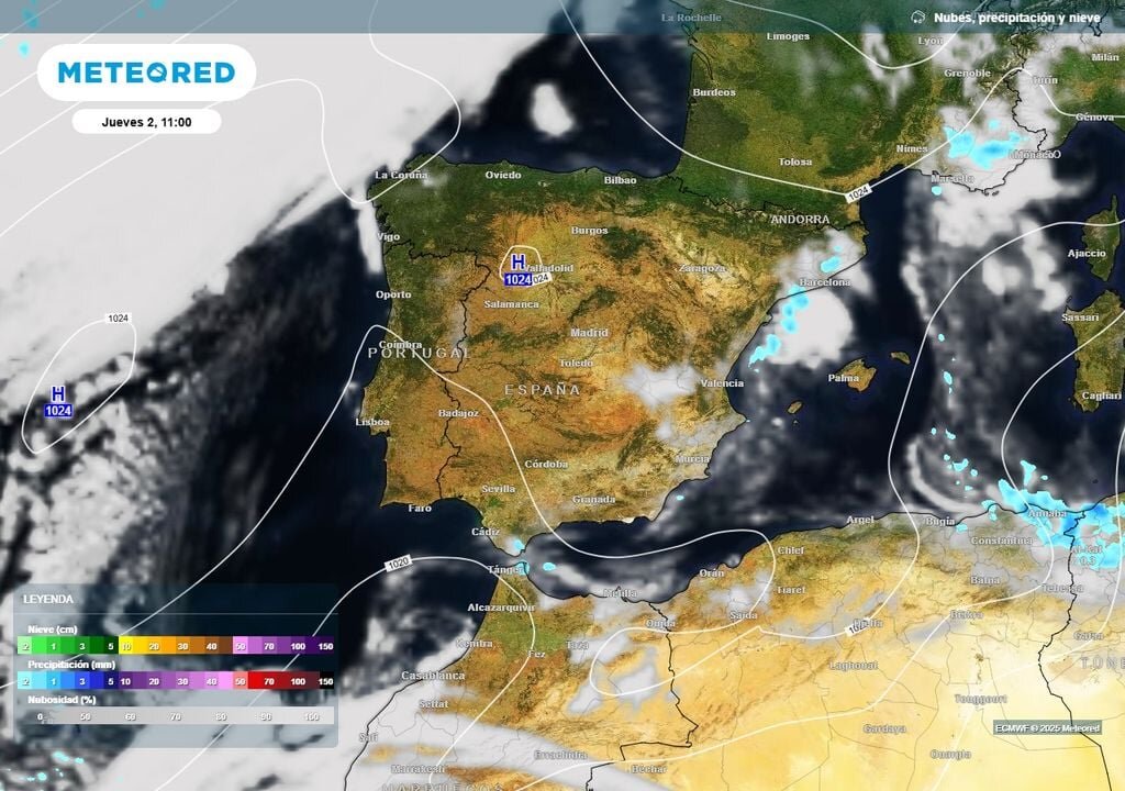 El jueves repetiremos un día con los cielos poco nubosos o despejados tanto en la Península como en los dos archipiélagos. Las temperaturas seguirán su escalada. Empezará a notarse calor en más zonas, las máximas subirán por todo el interior peninsular. Además, lo harán de forma acusada en la zona del Alto Ebro y en el interior de las comunidades cantábricas. Las temperaturas nocturnas seguirán parecidas, con ambiente frío en la meseta norte y en zonas de montaña.