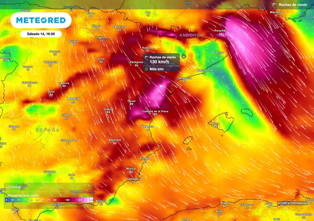 Las rachas superarán los 120 a 140 km/h en el Pirineo y Sistema Ibérico de Castellón y Teruel, así como en las cumbres de otros sistemas montañosos del este peninsular. Habrá que prestar especial atención a las zonas urbanas de Castellón y sur de Tarragona, en el interior y prelitoral. Poblaciones como Tortosa, Sant Carles de la Ràpita y Vinaroz podrían sobrepasar los 90 o 100 km/h, incluso en la capital de Castellón de la Plana.