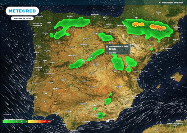 La cota de nieve se situaría entre 1300 y 1500 metros en gran parte del centro y norte peninsular, descendiendo hasta 900-1100 metros en el noroeste durante la mañana y la noche, y pudiendo alcanzar los 500-700 metros en zonas concretas de montaña.
