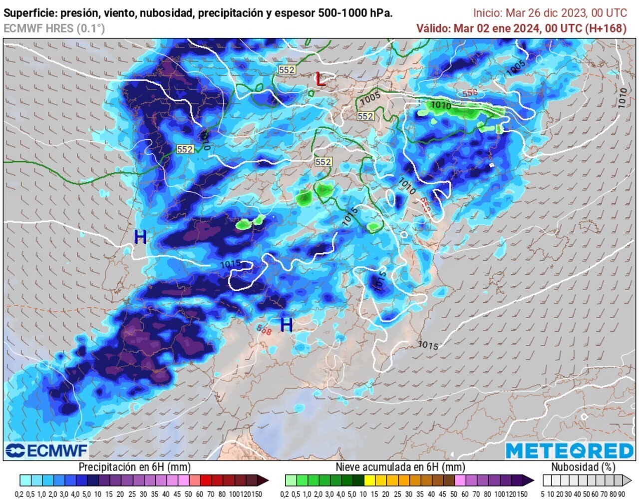 Por ahora, parece que durante las campanadas habrá precipitaciones en la vertiente cantábrica, en el norte de Castilla y León y en Galicia, donde las rachas de viento serán intensas en zonas de costa. Las lluvias podrían llegar a buena parte del país durante el Día de Año Nuevo, quedando quizá al margen las zonas del sur-sureste peninsular y Canarias.